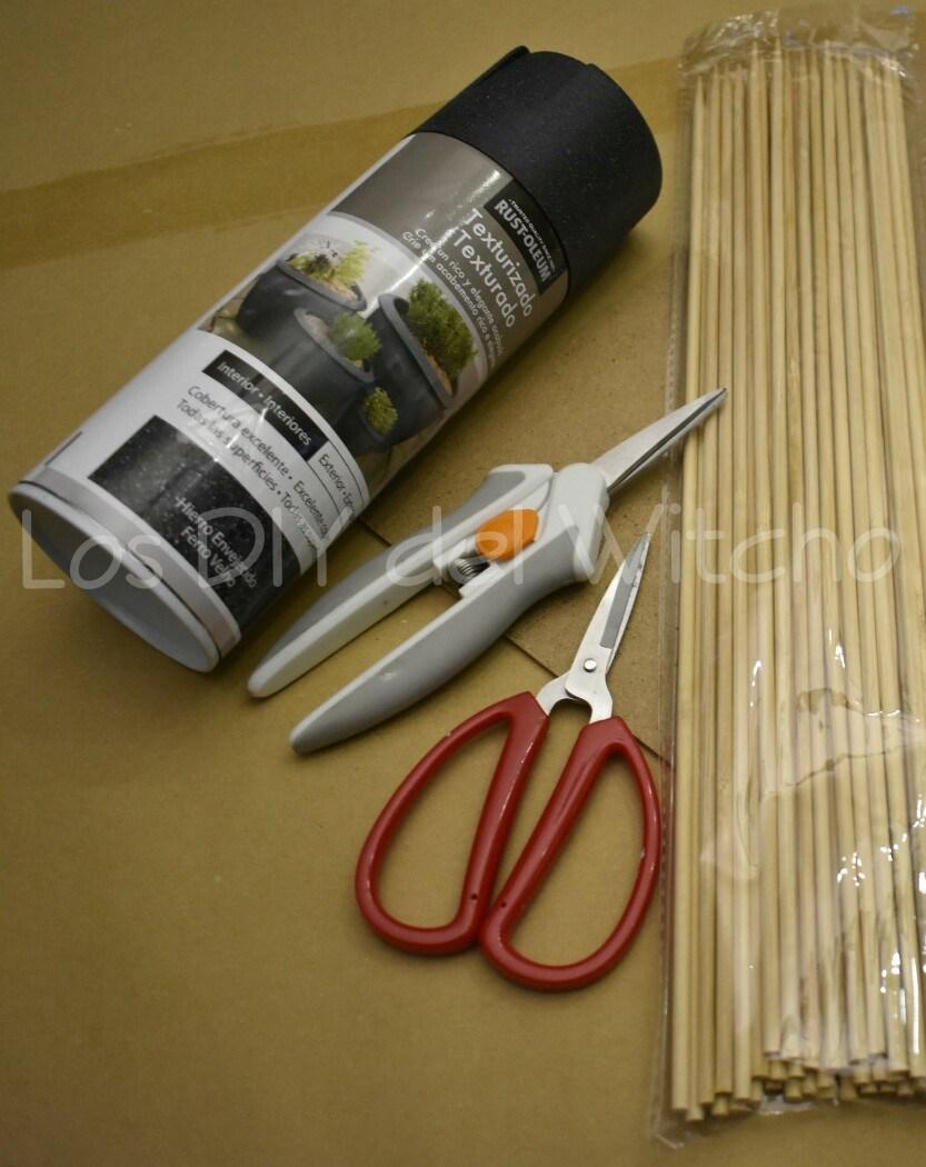 La idea es que la rejilla decorativa hecha con palillos de madera se asemeje a las de verdad. Este efecto se puede con la Pintura en Spray de Rust-Oleum en color Hierro Envejecido.