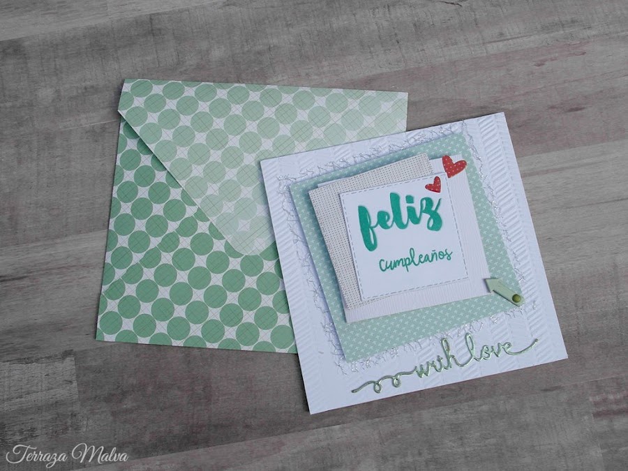 Los papeles que he utilizado son de las colecciones "Memorandum" de Pink Paislee y "Crush" de WRMK. Los corazones troquelados de Lawn Fawn llevan una capa de Glossy Accents y dan contraste a la paleta de colores que he utilizado como base (blanco, gris y menta). Para el sobre he usado un papel con efecto degradado de Studio Calico también en la misma paleta de colores.