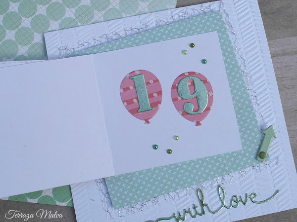 En el interior, unos globos troquelados revelan los años que va a cumplir. Los números llevan una capa de foil que he adherido usando los polvos de embossing "Sticky" de Ranger (al aplicar calor quedan "pegajosos" y el foil se pega estupendamente). Para aplicar el foil en el troquelado "with love" he usado en cambio paper adhesivo de doble cara en la cartulina, he aplicado el foil y después he troquelado (este sistema también me funciona bien.)