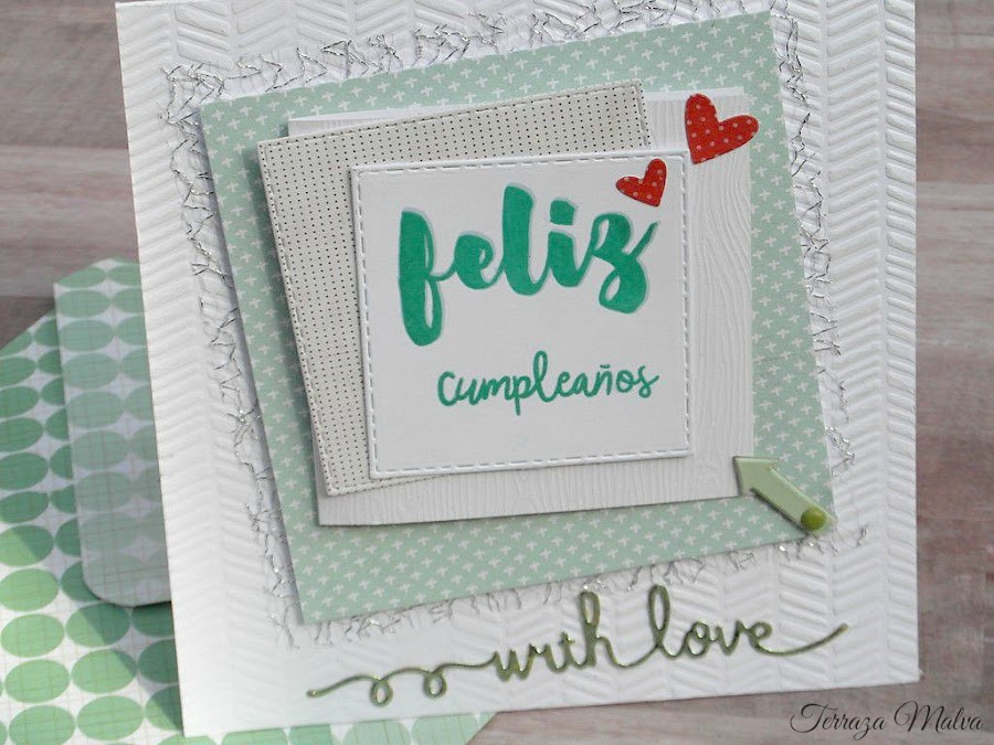 Es una tarjeta doble porque además de la base normal de una tarjeta hay otra tarjetita más pequeña en la portada. Está sujeta con el chipboard de la flecha que gira gracias a un mini brad.