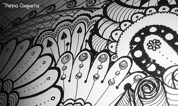 Sí, sí, debía publicar esto el domingo... pero bueno, no daré excusas. Stella esta vez nos propone un doodle - zentangle, que en nuestro diccionario particular es "zen-trazo" (palabra muy expresiva inventada por Stella) y que es mucho más libre, como nosotras :D Así sin normas, dejamos que salgan nuestras líneas, tomemos algún motivo y lo repitamos... pues eso, dejarnos llevar. Y esto es lo que me ha salido a mí.