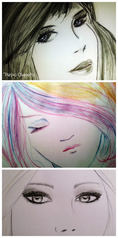 Otra de mis carencias es la pintura, domino los lápices y los rotuladores, algo los pasteles. .. pero lo de pintar con pincel, eso me parece imposible. Hace poco me compré unos lápices acuarelables, por cercanía a las acuarelas, así que ayer me lancé a estrenarlos con los rostros, primero dibujé a lápiz, tracé algunas líneas con los acuarelables y luego ya el pincel.... juzgar vosotras mismas... es lo primero que hago. Utilicé como modelo unos cuadros de Pinterest, y bueno. .. ahí están. El primero tal vez debí parar antes de seguir pintando...