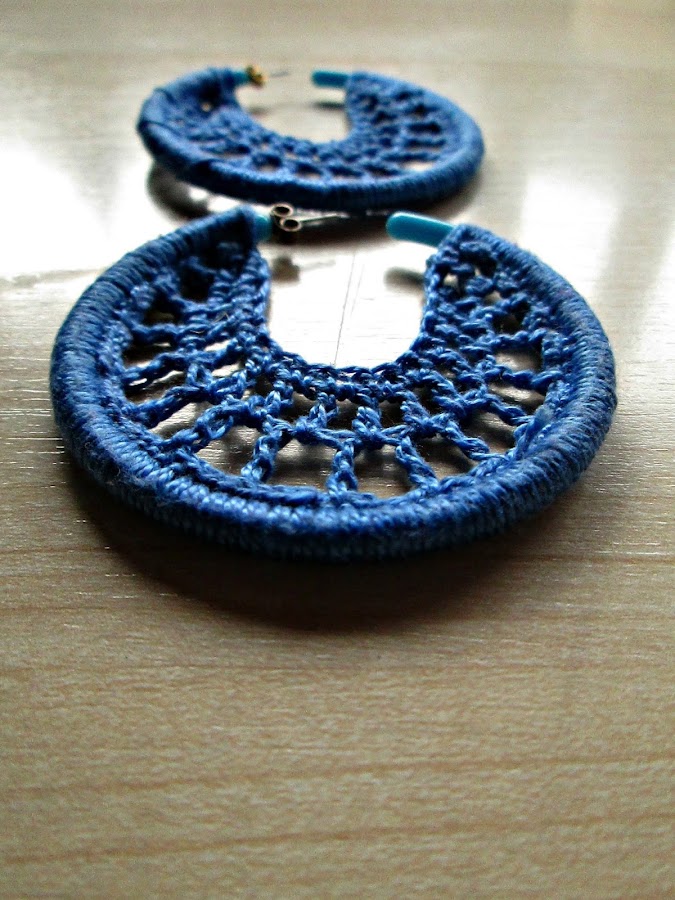 Hoy, os traigo unos aros azules que tenía y que no usaba a los que les he dado un nuevo aire, tejiéndolos a crochet. No me pregúnteis por el patrón porque lo fui haciendo sobre la marcha, según saliera. Desde luego, no es nada fácil tejer con algo tan rigido pero lo conseguí.