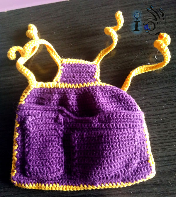 Y aquí os enseño un detalle del delantal, con todos sus bolsillos, al que yo quise poner un ribete amarillo para ponerle el toque de color: