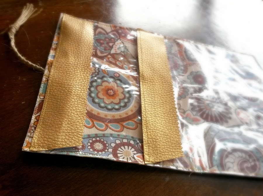 de eco piel dorada(como me gusta :)), forrado de tela y con los bolsillo en plástico trasparente, para que tengamos todo bajo control de un solo vistazo
