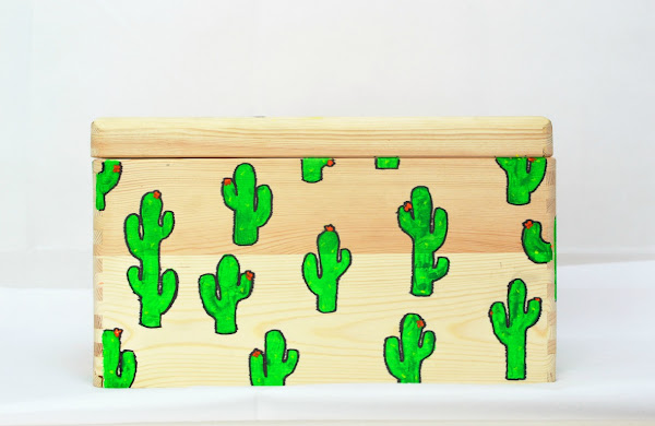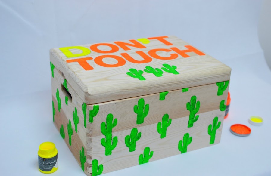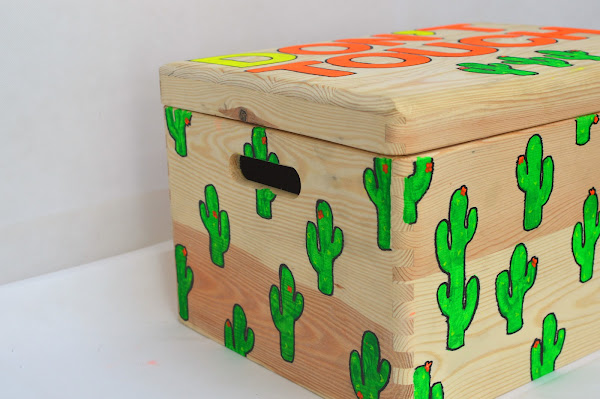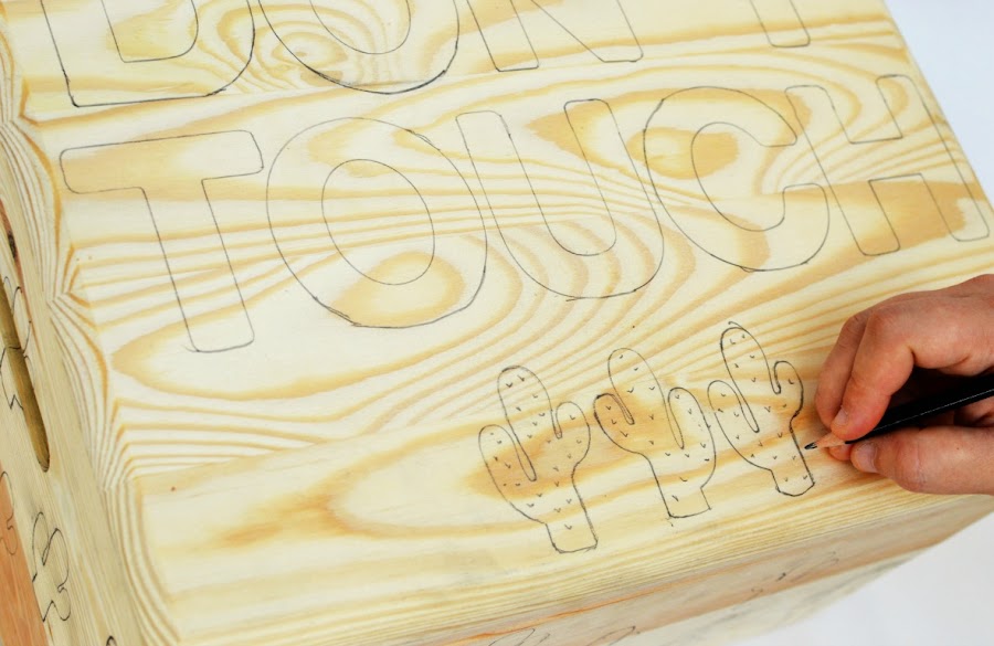 Como siempre, antes de trabajar en madera la lijamos para preparar correctamente la base. Después con ayuda de unas plantillas dibujé los cactus y la frase "Don´t touch" Si tu eres manitas y el dibujo es lo tuyo puedes pintar algo a mano alzada. Personalmente, no me atreví.