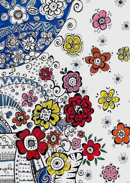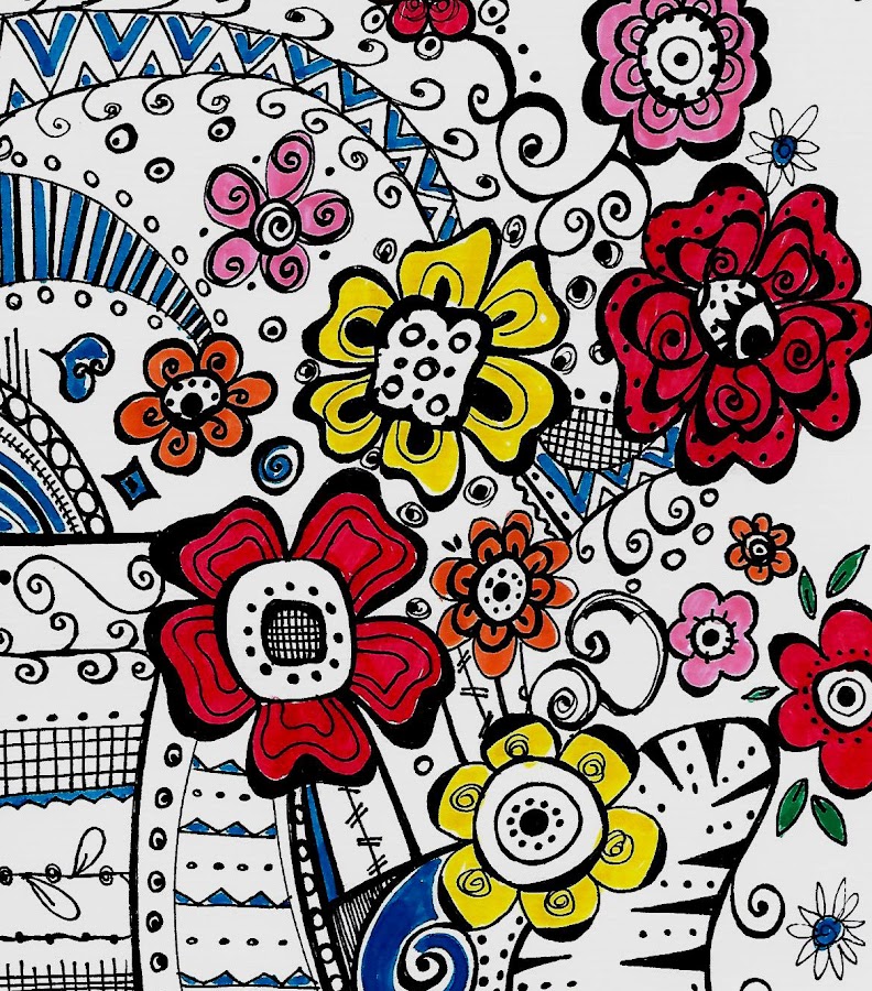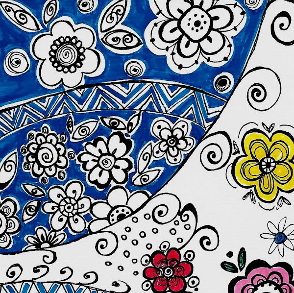 Para hacer las flores doodles hemos utilizado rotulador punta fina negro y hemos dado color con rotuladores variados. Hemos creado dos zonas jugando con el fondo y el contraste del color vivo y el blanco.