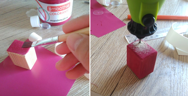 Con un cubo pequeño de madera he formado un buro para sostener esta simpática lampara, la cual esta formada con una lagrima de plástico y algunos chaquirones ensartados en un alambre galvanizado, que luego inserté en el orificio, con la tapa de un bote, tipo pasta dental, he formado la pantalla (que también pude haber pintado o forrado)