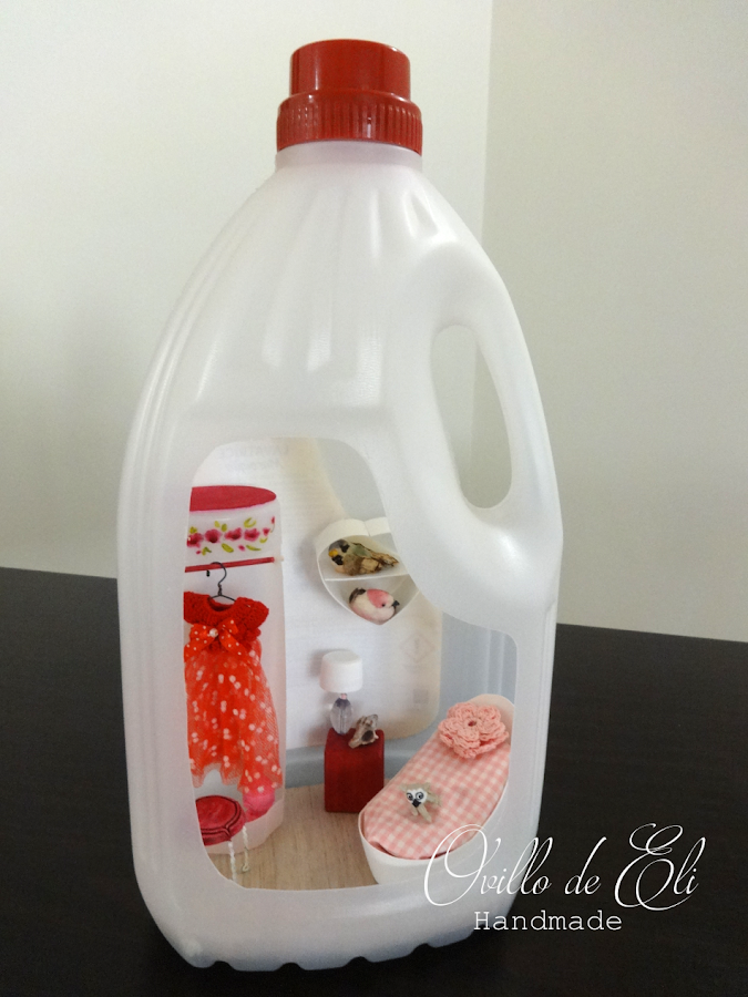 Para crear el "dormitorio" he utilizado un bote de jabón de 4 litros, la etiqueta del producto resulta ser una plantilla que respeta la forma del plástico, de modo que he recortado por su contorno formando la entrada, también se podrían cortar ventanas adicionales... para el piso he usado un corte de duela o parqué, también se pueden usar cortes de madera, esto con el fin de darle estabilidad al mobiliario