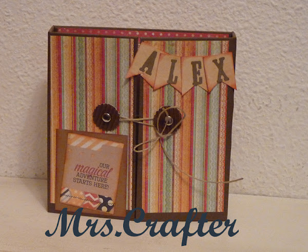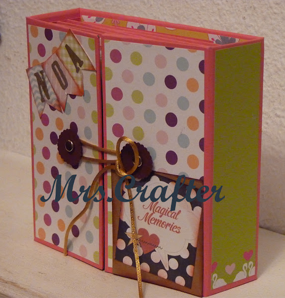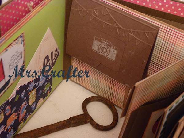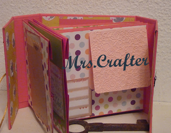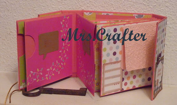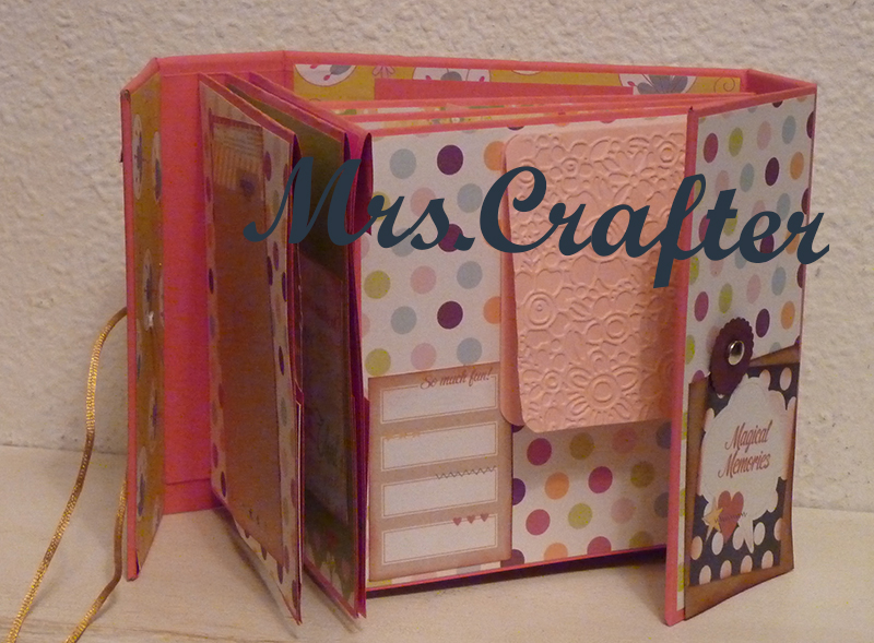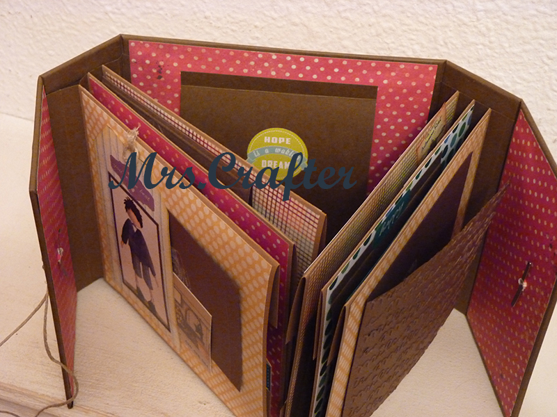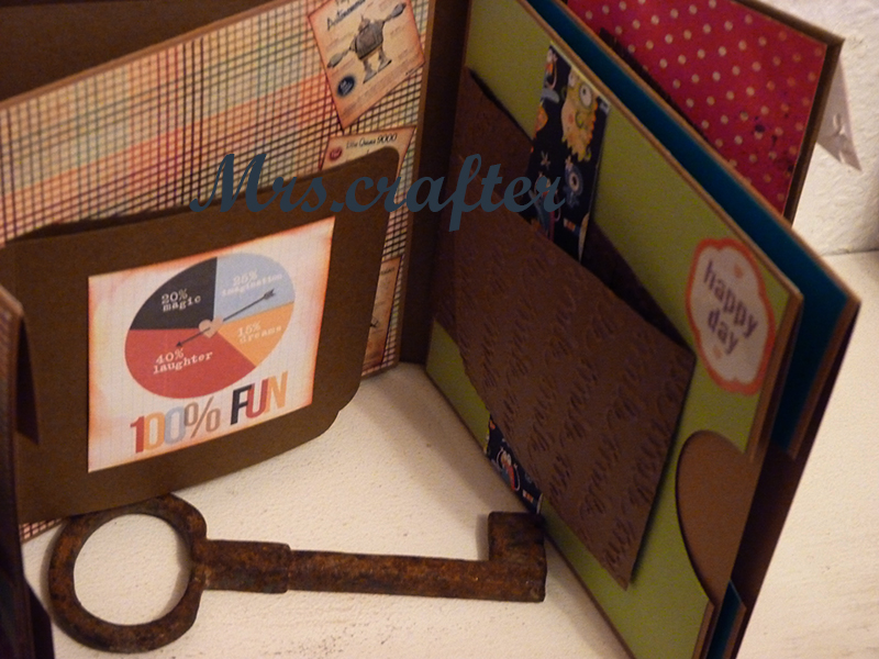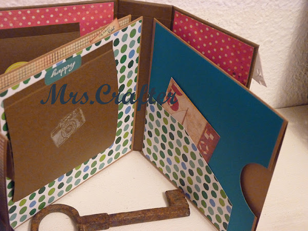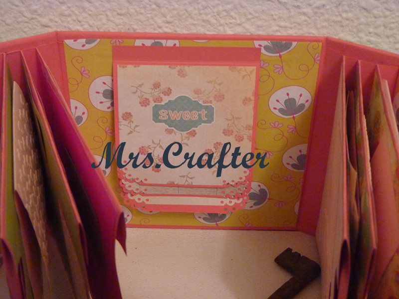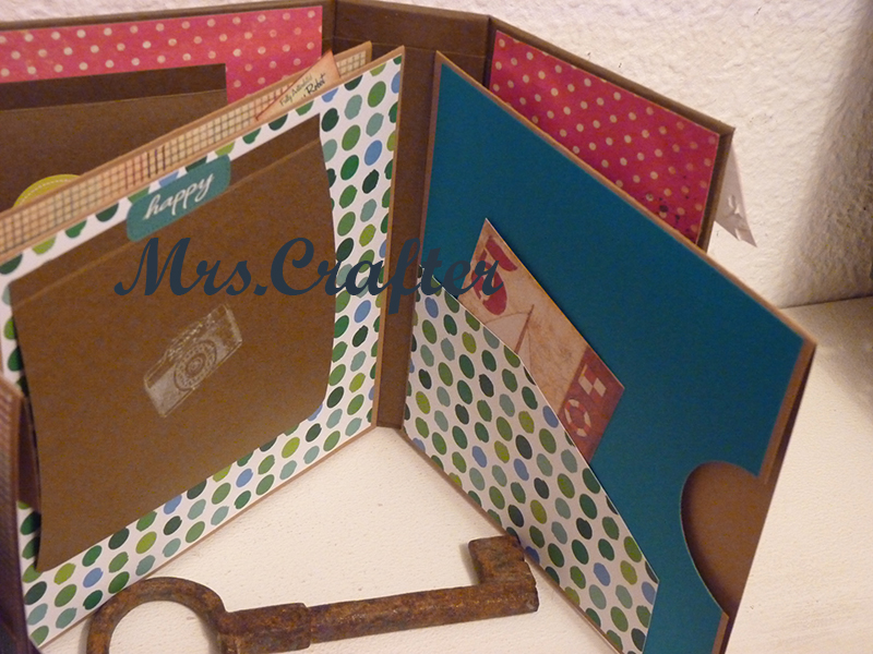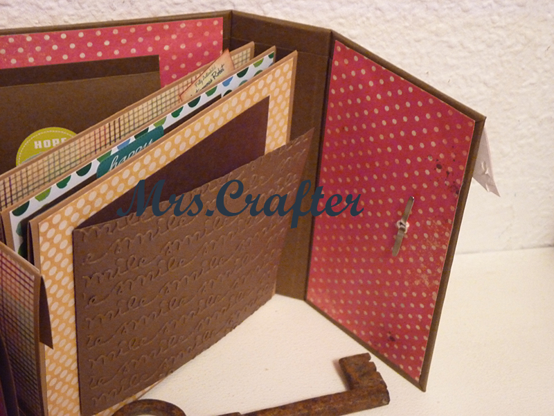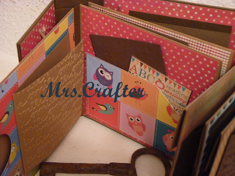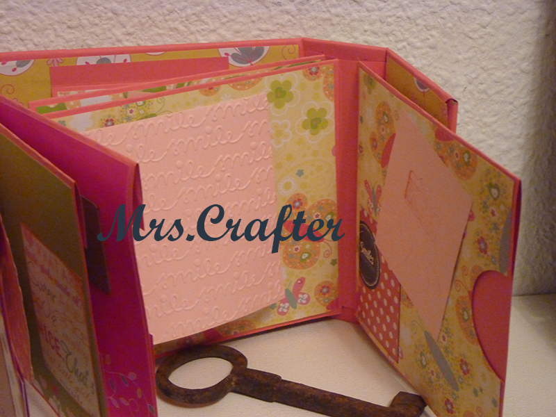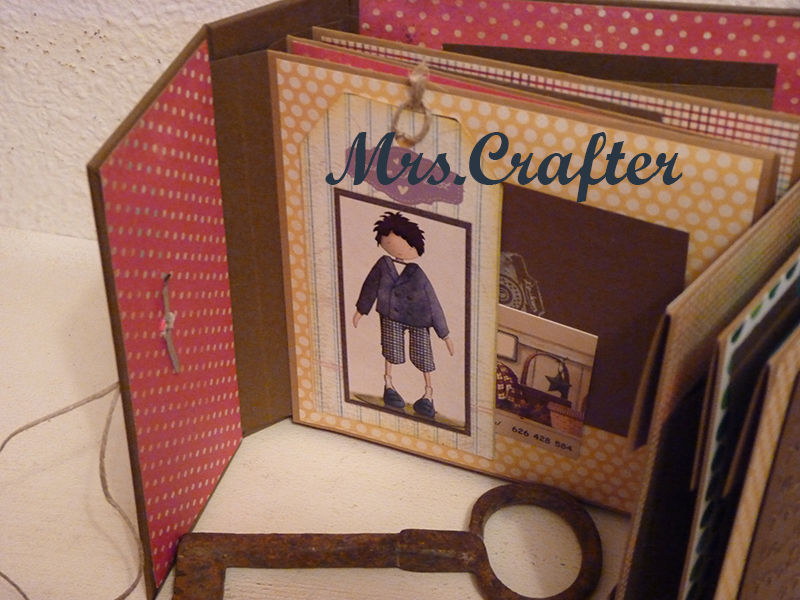 Formato armario, tamaño más pequeño que los que hago habitualmente (16x16 cm.), con 6 hojas en el interior, 3 a cada lado que se despliegan al abrir el "armario".Las 6 hojas son sobres donde colocar más