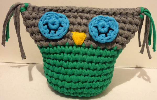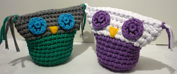 Ambos búhos están hechos con trapillo y a crochet o ganchillo. En este caso están tejidos en circular, la técnica mas habitual para hacer amigurimis, sean del tamaño que sean... jejeje Los rellene con con relleno de peluches y algo que pesase, para poder soportar la puerta.