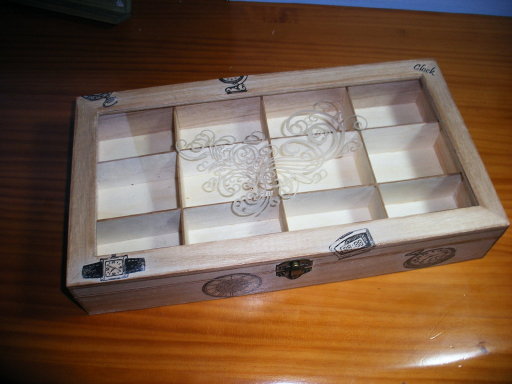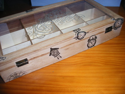 Una caja, tallado el cristal de la tapa y adornada con transfers alusivos al destino de la caja, envejecida con betún de Judea y barniz, menos pretenciosa que la original (de madera noble y terciopelo), pero hecha con mucho más cariño.......para guardar los relojes que andan desperdigados...