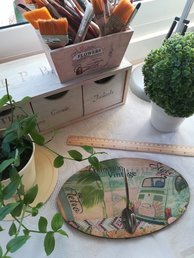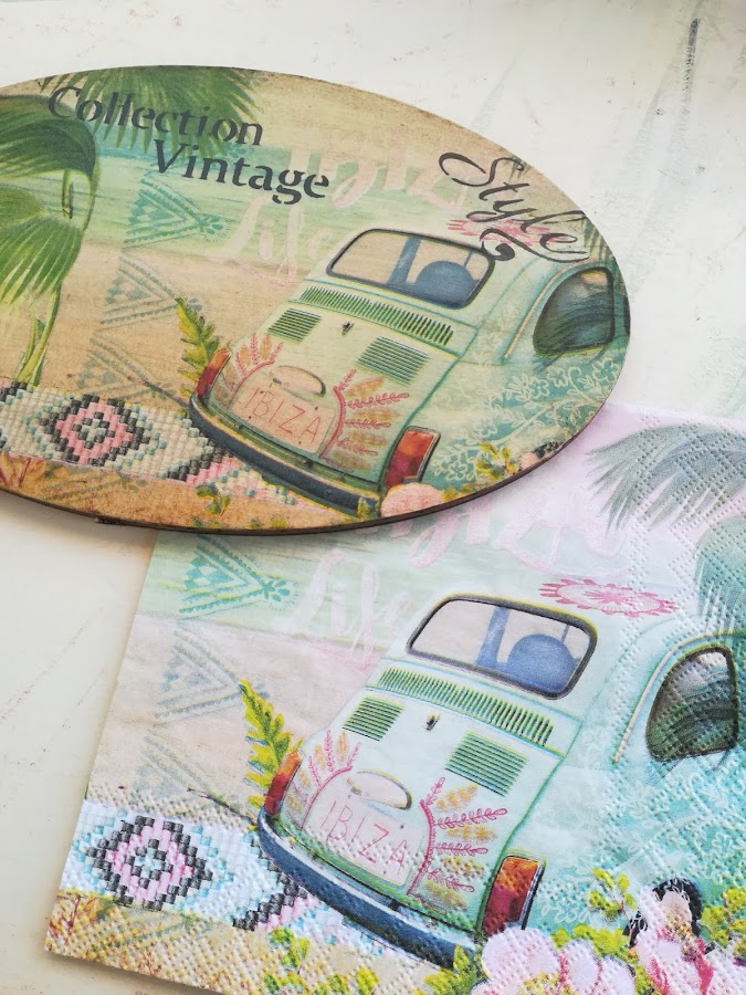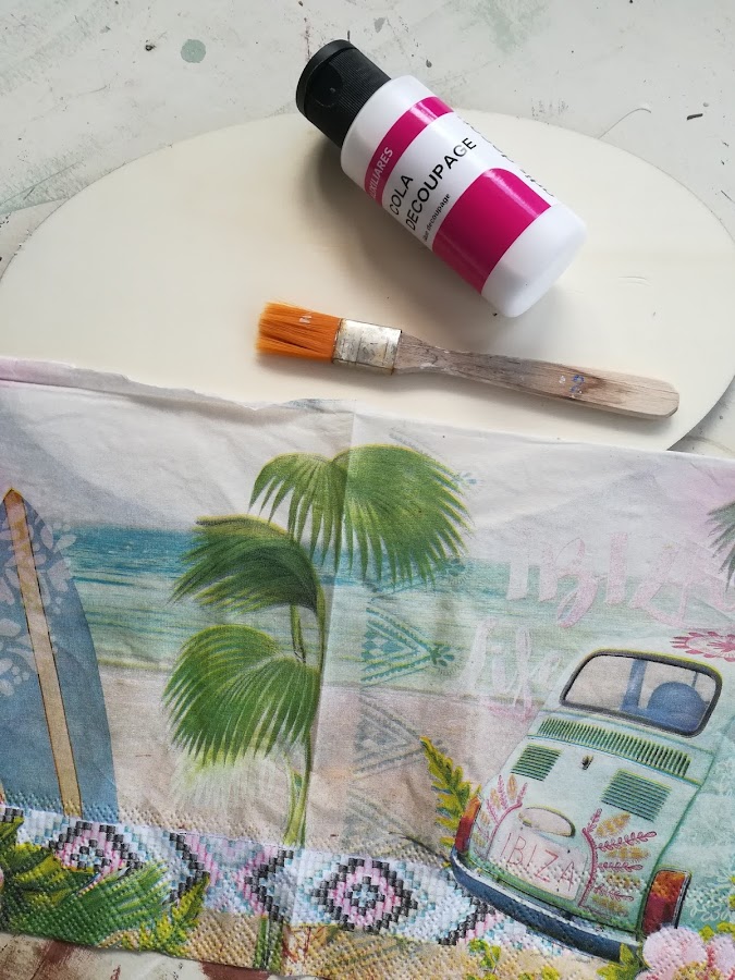 Planté de blanco la placa y le hice el decoupage con plancha, como siempre. Luego barnicé con barniz acrilico mate