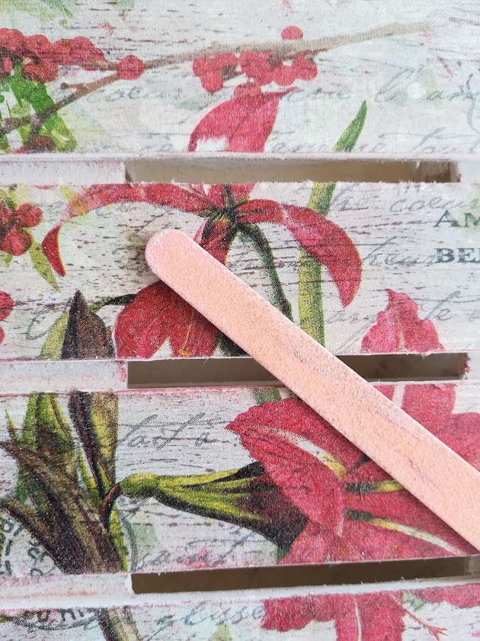 Dejé secar por completo y luego con una lima de uñas fuí lijando todas las lamas de madera. Es entretenido, pero no tiene mayor dificultad....