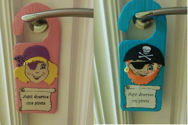 Tras recortar y sujetar las piezas con silicona pasé a pintar los detalles de las caras con los rotuladores permanentes y listos para colocar en las puertas para que los piratas puedan descansar como es debido.