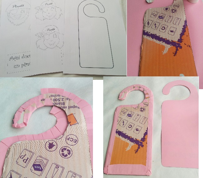 Lo primero recorté la plantilla del marcador y lo dibujé en el cartón, coloqué un folio de color (para la niña en rosa y para el chico en azul porque eran los colores que tenía en casa no por otra cosa), y recorté con el cartón forrando el marcador, por esto realicé dos plantillas; una para la parte delantera cortada con margen y la otra justa a la plantilla de cartón para tapar las dobleces. Lo he pegado todo con pegamento de barra normal.