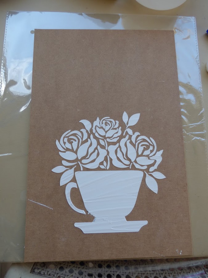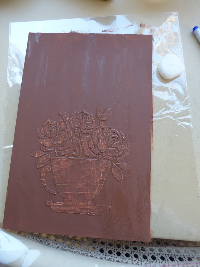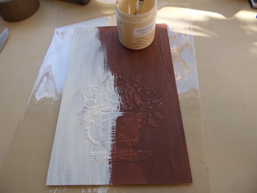 En la tablilla que no lleva decapado, después del relieve he pintado todo de blanco y luego he ido coloreando con las ceras.....
