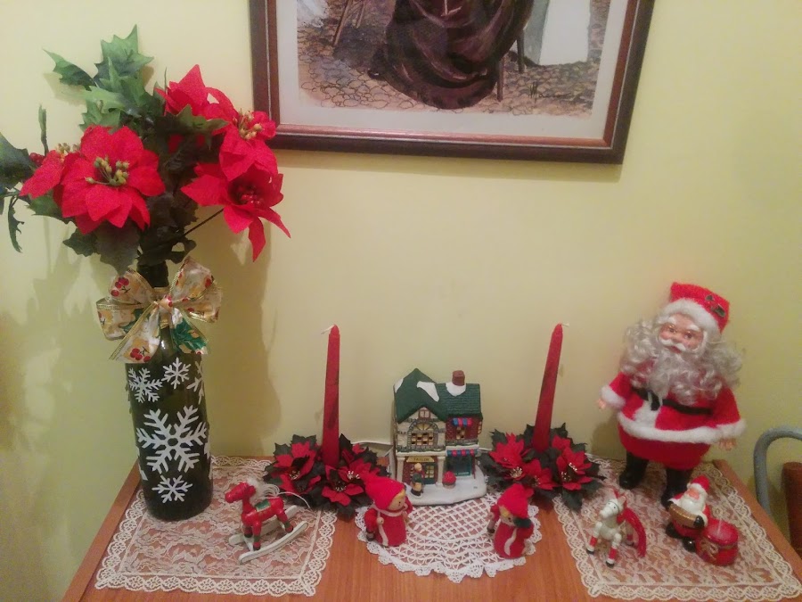 Y para juntar todos mis recuerdo infantiles la he colocado en esta composición navideña que tengo en el pasillo, el frío lo representan los copos de nieve y el lazo en forma de bufanda, la Navidad las flores de pascua y el rinconcito donde la he colocado. Lo que no he podido representar es el olor a mandarina, así que eso lo dejo a vuestra imaginación