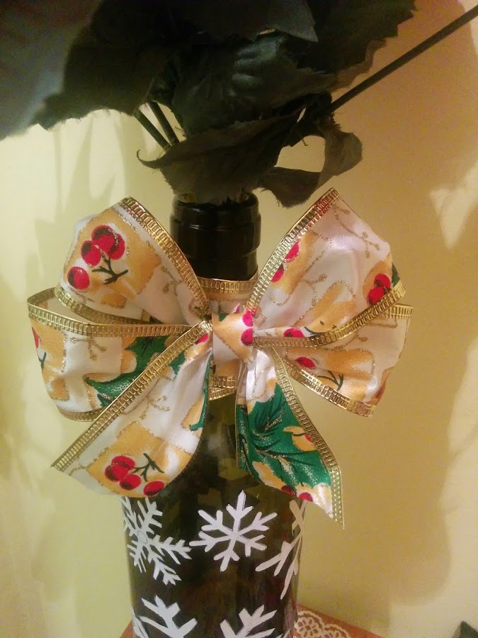 Todo está hecho con materiales reciclados, los copos están impresos en hojas recicladas y por su puesto la botella. Tampoco tenía muy claro qué sería la botella una vez decorada pero al final me decidí por que fuera un jarrón donde poner unas flores de pascua, como me quedaba un poco sosilla le he puesto este precioso lazo doble cuya cinta estaba por casa desde hacía algunas Navidades y se la he puesto en forma de bufanda en el cuello de la botella. Por último unas flores de pascua que estaban solitarias en una caja y que este año no habían tenido lugar en la decoración navideña de la casa.