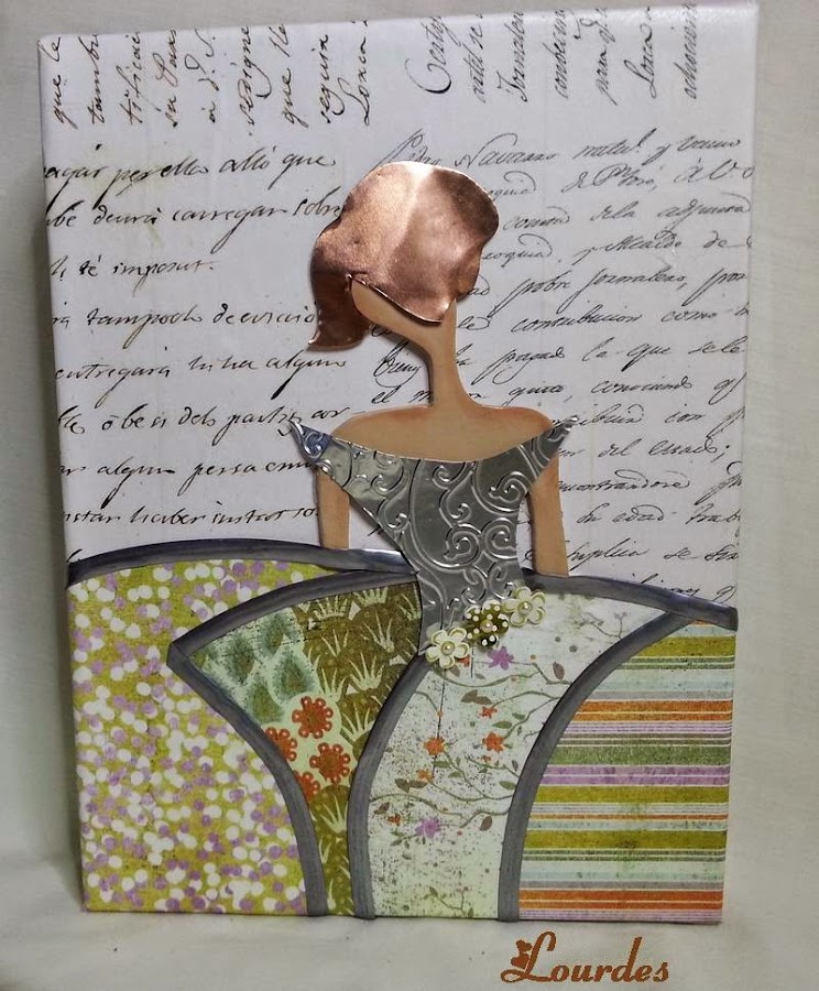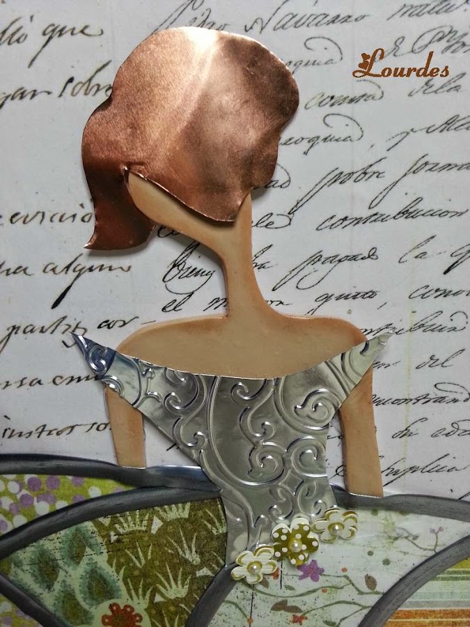 Poder celebrar 60 años juntos es todo un lujo. 60 años de amor. Una vida de amor Felicidades. Figura realizada en arcilla polimerica combinada con alumnio en plata y cobre Cinco papeles diferentes para el vestido y remates en plomo adhesivo de dos tipos Detalles en el fondo con pintura glitter y adorno de corazón en oro viejo
