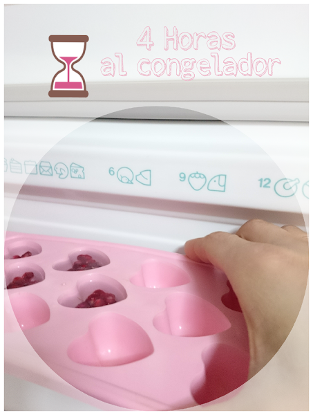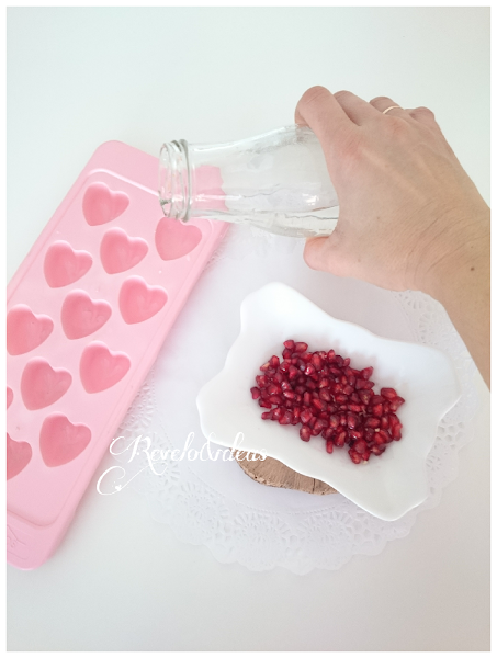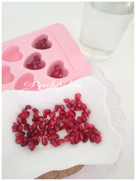 En primer lugar rellenaremos los corazones de la cubitera con el agua mineral, después le pondremos por encima unas cuantas pepitas de granada, dejaremos reposar 5 minutos, una vez hecho esto, introduciremos la cubitera en el congelador y la dejaremos unas 4 horas.