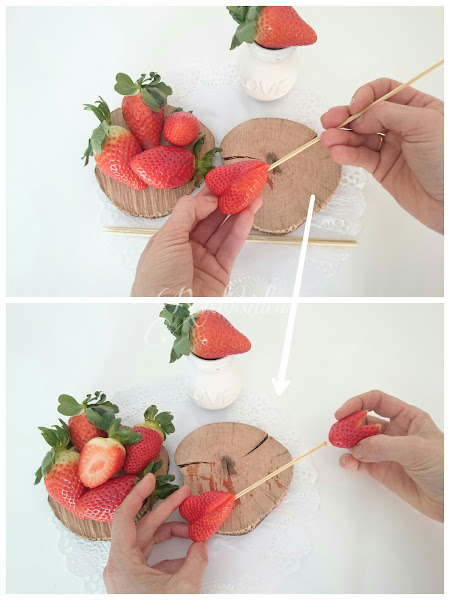 En primer lugar lavaremos bien las fresas, y realizaremos un corte a lo largo de la fresa, en forma de bisel, como se ve en la imagen, para ello cortaremos dos fresas, colocaremos los dos trozos de fresas previamente cortados en bisel, enfrentados entre si, formando un corazón con ellas, colocando un palillo por el centro para sujetarlos, también cortaremos el extremo que sobra, ayudándonos de una tijera de cocina. Como se ve en las imágenes de abajo.