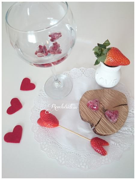 Lo primera idea es un agua infusionada, con cubitos de corazón con pepitas de granada, y la segunda idea es una flecha de cupido hecha con fresas.