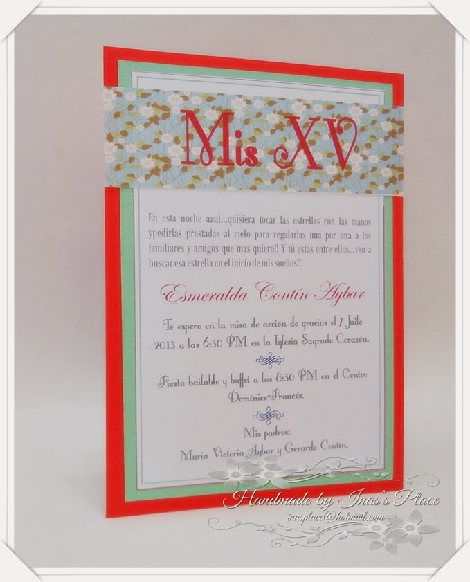 Mi última propuesta para cerrar la semana son dos invitaciones que realicé con motivo de celebración de las 15 primaveras.Uan festividad muy esperada y donde se derrocha alegria,elegancia,diversión y mucho color!! claro,siempre depende del gusto de la festejada.