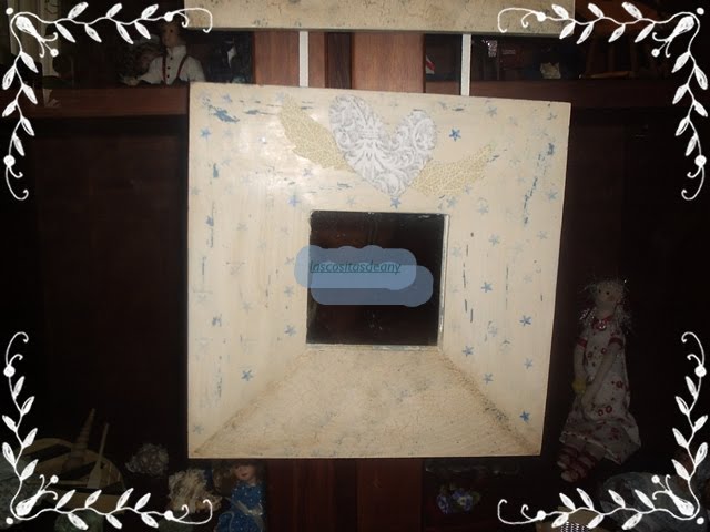 que partido les sacamos a estas cajas...con esta tecnica quedan preciosas..toda pintada en azul fuerte,puntillas y una flor normal de plastico,puntillas,y despues con plata,y voila..me encantan como q ...
