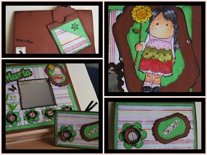 En el segundo el adorno es una magnolia, de la magnífica colección de Patricia, y coloreada con distress, con glossy acent en varios detalles y montadas en troquel nestabilities "Labels Four", gentileza de Ruth. Las flores de tela son regalo de una buena amiga, Belén, gracias! El papel es de la misma colección del anterior y el modelo es "Adorable"