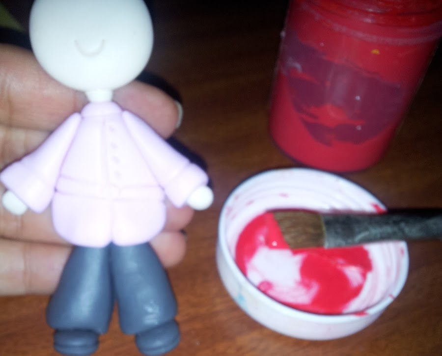 3.- Luego, hice la chaqueta y sus mangas, en este caso como me había sobrado masa color morita de otro trabajo, la usé para posteriormente pintarla de rojo.