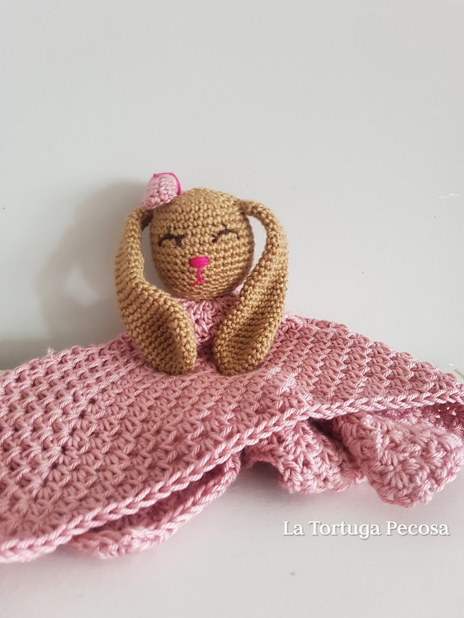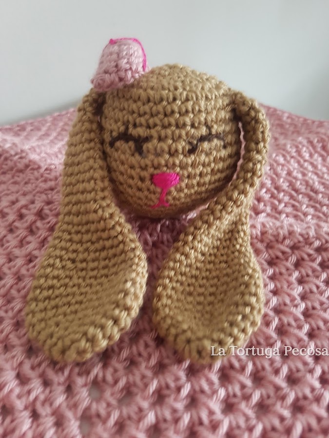 Feliz sábado y feliz día!!!. Este dou dou lo comencé a hacer en nuestro viaje a NYC en el avión. y estuve de lo más entretenida. Color rosa pálido y con la cabecita de una señora coneja con lazo y todo, para desear los más felices sueños a los bebés recién nacidos.