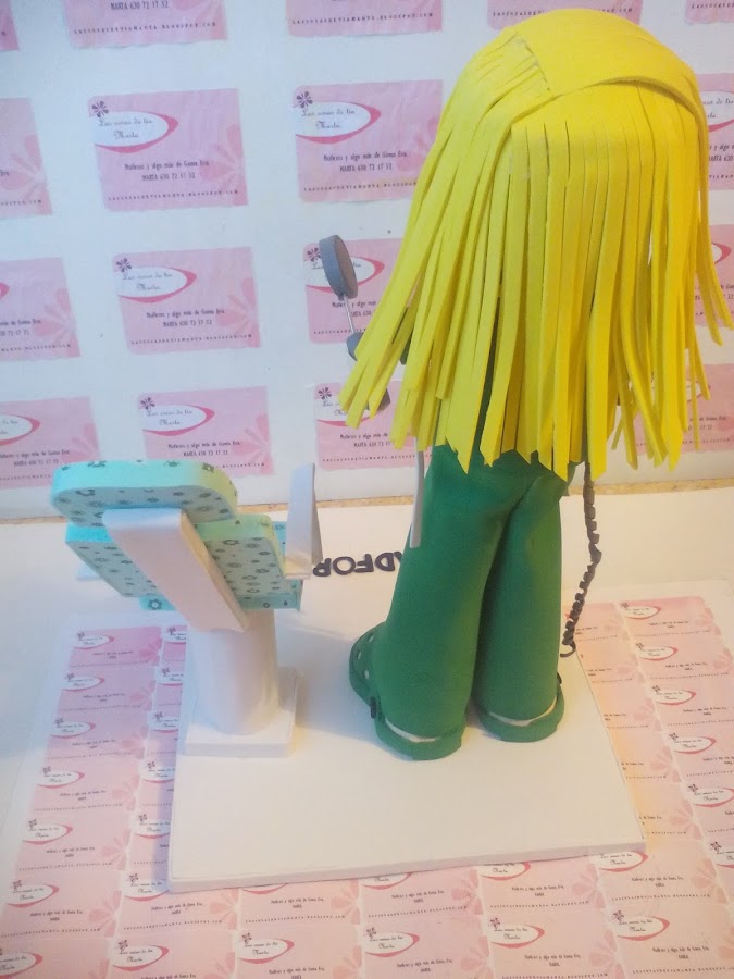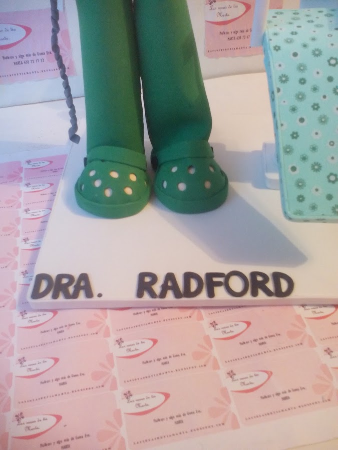 Esta semana vengo con Bárbara, Graduada en Odontología y por lo tanto Dra. Radford, que ha dejado por un momento su cómoda clínica y lugar habitual de trabajo para pasarse por mi blog y conocernos. Cómo podéis ver no le falta detalle: pijama verde como uniforme de trabajo, zuecos a juego, mascarilla deshechable, gafas, utensilios de dentista (explorador dental, espejo redondo)...y como no un cómodo sillón donde sentarse para que pueda trabajar cómodamente.
