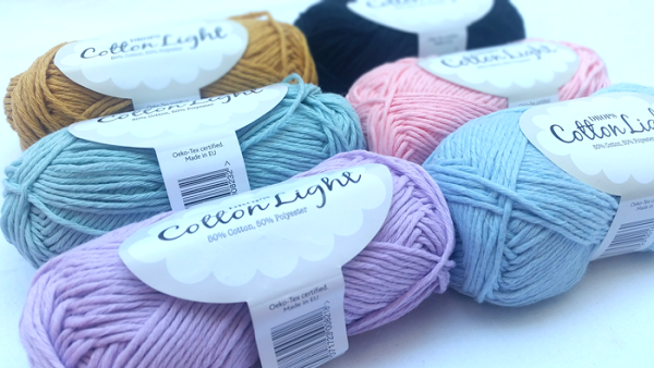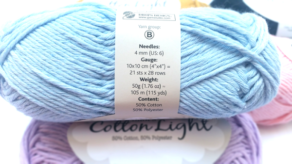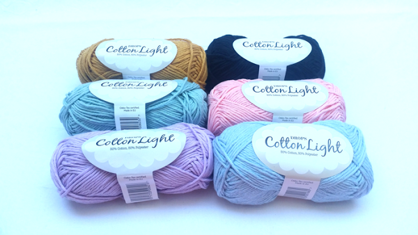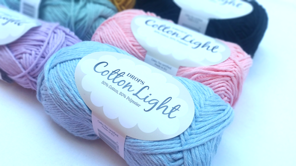 Cotton Light es un hilo de 4 cabos, compuesto por un 50% algodón y un 50% polyester. Esto hace que sea algo duro y áspero a la hora de tejer con él, pero el acabado que da es muy agradable.