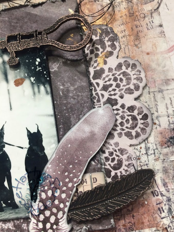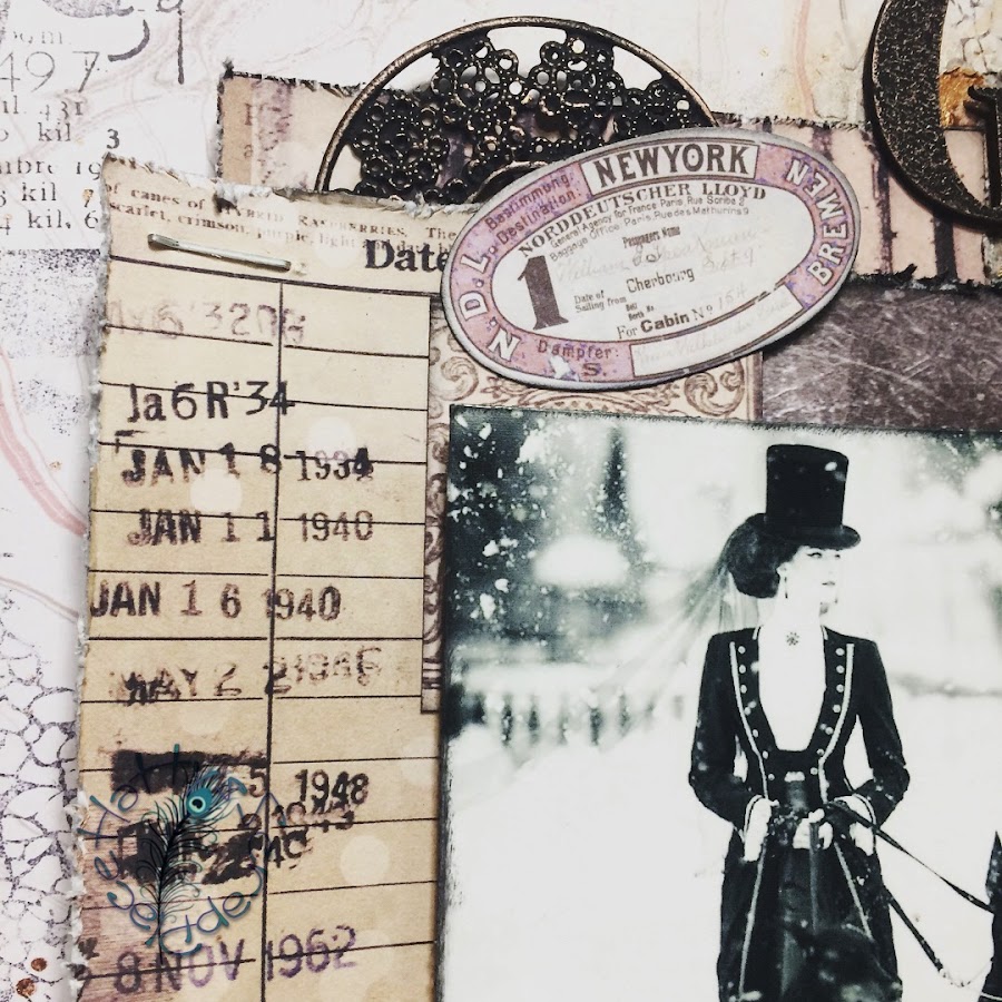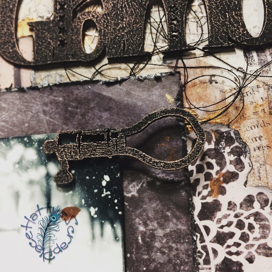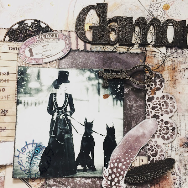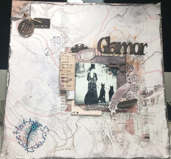 También incorpore mis elementos metálicos, hilo negro, una foto que me parece brutal y la palabra GLAMOR que es un chipboard que tenía que también pinte con gesso negro.