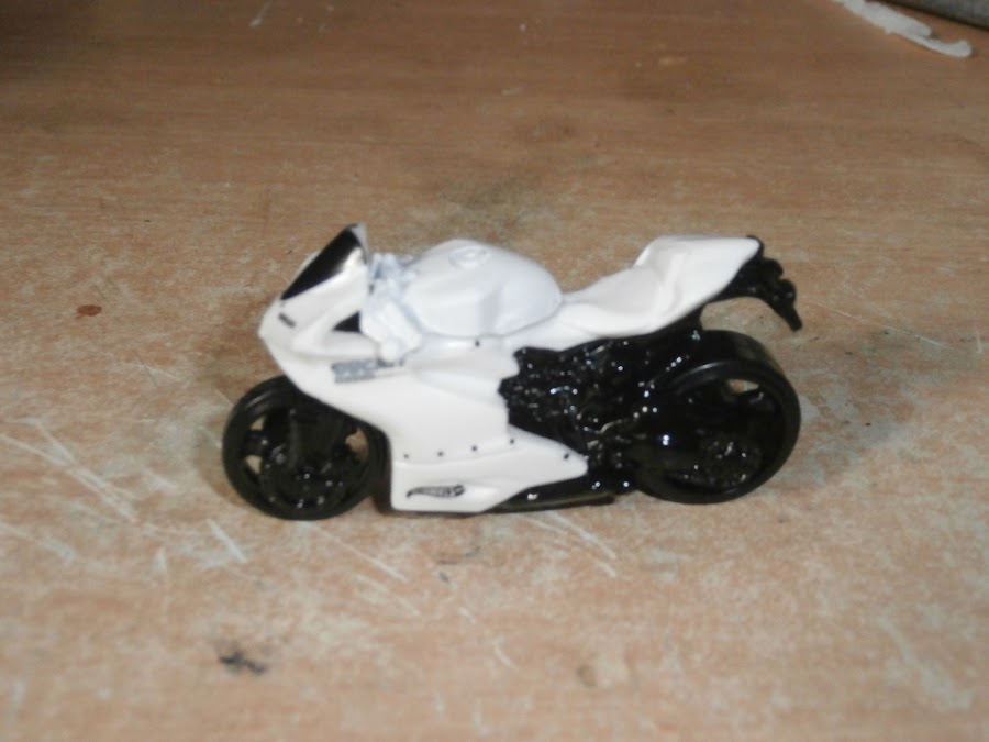 Otra motito Hotwheels, me gustaba el modelo, pero no estaba del todo bien logrado. Asi que la desarme por completo y lo modifique. Con clips y cables le construi la horquilla, luces y el porta equip ...