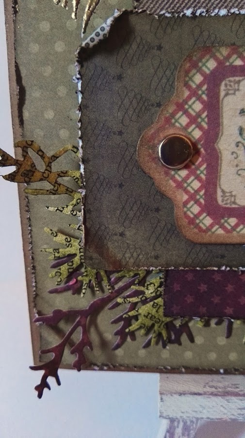 Base de tarjeta marron craft, papel decorado verde de topitos, composición de papeles de la misma colección con los tonos vintage de granate, verde y marrón, todos ellos rasgados por los bordes y entintados con distress walnut stain, encima uno de los chipboard que os mencionaba antes, sujeto con dos brads, y para acabar de decorar, en la esquina superior un emboss dorado con pasta de relieve, y las hojas de pino troqueladas con un troquel navideño de Tito Tim en hojas de libro viejo entintadas de verde y marrón, para finalizar, como veia la parte de arriba muy sosa, le añadí otro pequeño chipboar con un brad, et voilà, eso es todo
