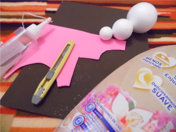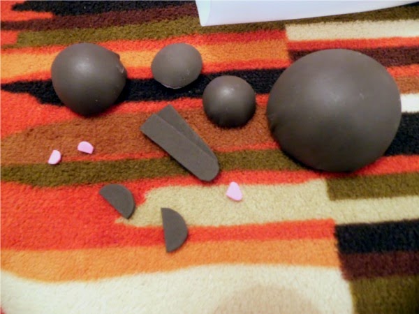 Luego vamos a trazar un círculo de unos 2.5cm de diámetro en fommy (café) y lo recortamos a la mitad. Luego uno de 1cm (rosa) y lo recortamos a la mitad, también necesitaremos un triángulo rosa para la nariz y unos rectángulos con punta redonda para los brazos, tal como se ve en la foto. Forramos las mitades de fommy como lo vemos en este video del blog Manetes Bones