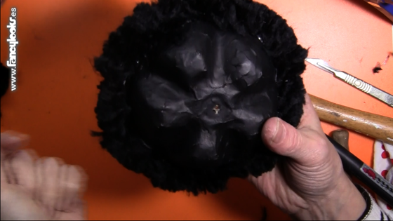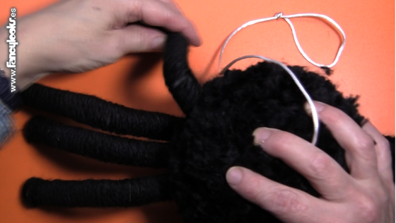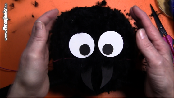 12. Trasquila un poco la lana de la araña con unas tijeras para igualar la pelambrera, trasquila un poquito más donde vas a pegarle los ojos para que te resulte más fácil hacerlo