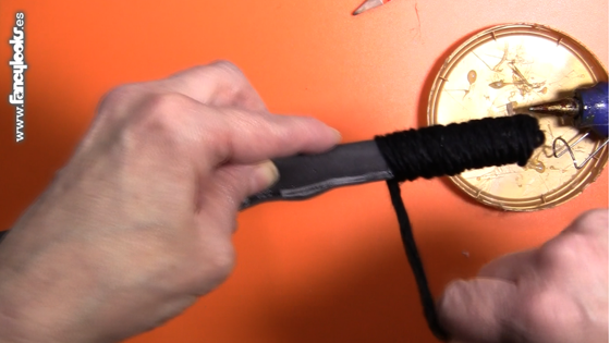 6. Pon un hilo de silicona caliente en cada lado de la tira de cartón forrada por el borde que no tiene cinta adhesiva y vete enrollando lana negra gorda si que las vueltas de lana se monten unas sobre otras, para que a todas les toque la silicona. Cuando enfríe, corta la lana a lo largo por el lado del cartón que no tiene silicona.