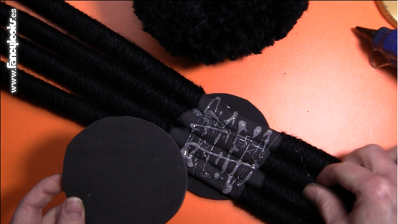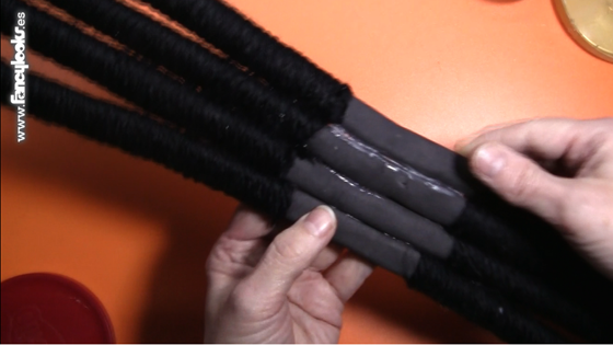 10. Prepara las patas. Corta cuatro tiras de alambre de unos 45 cm de largo y enróllales unas tiras de goma eva negra, de 45 x 5 cm, todo a lo largo, fijado las vueltas con silicona caliente.