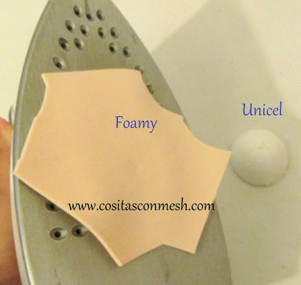 2.-Cortamos un retazo de foami del color que querramos,calentamos la plancha y sobre el colocamos el foamy,cuando el foamy se este como inflando(termoformar) lo quitaremos para forrar la bola de unicel.