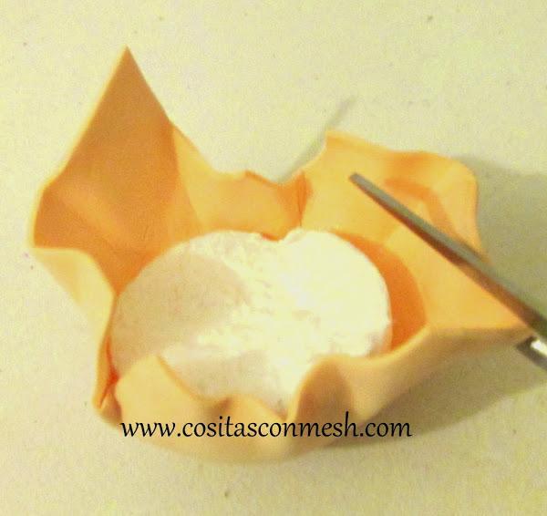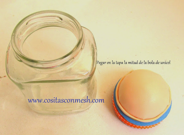 5.-Corto un circulito de foamy y lo pego en la tapa del frasco de vidrio ,luego pego encima mi bolita de unicel ya forrada .