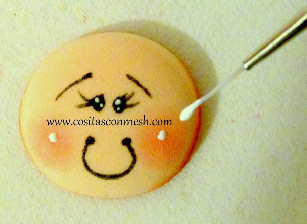 Usa rubor y con un hisopo ponlo en los cachetes,luego pon un puntito de pintura blanca,para darle luz a la carita y ojos.