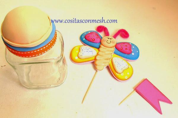 Y yo claro feliz de poder ayudar con una manualidad en la que estemos reciclando ,y darle un nuevo uso como " Dulcero" ,elegí hacer una figura de mariposa en foamy y ponerla como parte decorativa del frasco,podemos poner en el dulcero una banderita y escribir el nombre de la cumpleañera o el nombre del invitado.