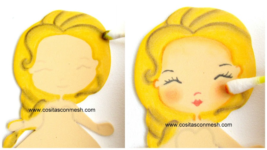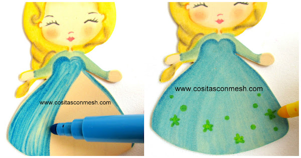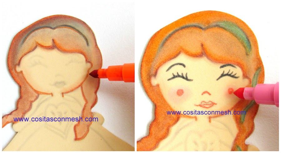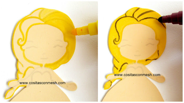 8.- Use la misma técnica para pintar a Ana "Frozen". El cabello lo pintamos con plu,ón naranja y un poquito de marrón. El listón de su cabello lo pinte con plumón celeste.