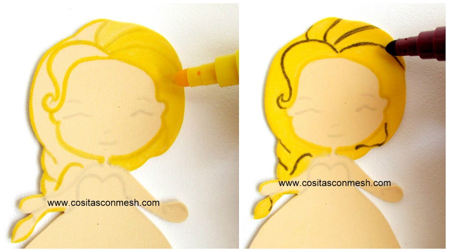 2.-Usa foami color piel para transferir los moldes de Ana y elsa " Frozen". Luego con plumón amarillo pintamos el cabello de Elsa.( Cuando pintes hazlo en una sola dirección )