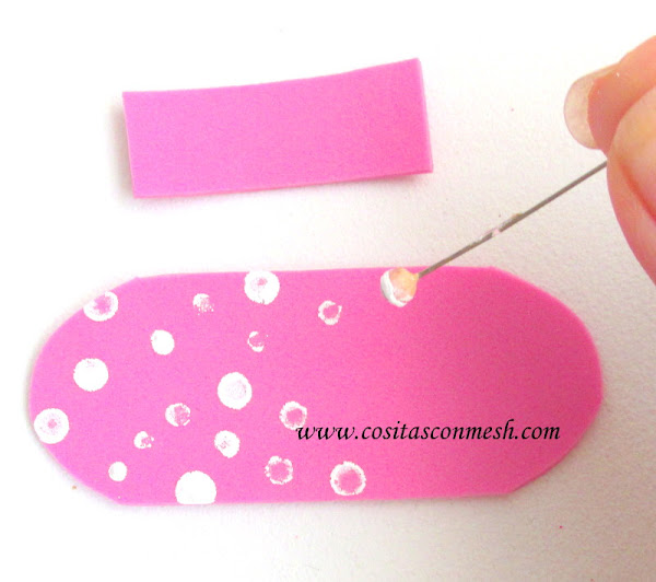 Con un alfiler redondo y pintura acrilica blanca, pinto puntitos blancos en el moño.