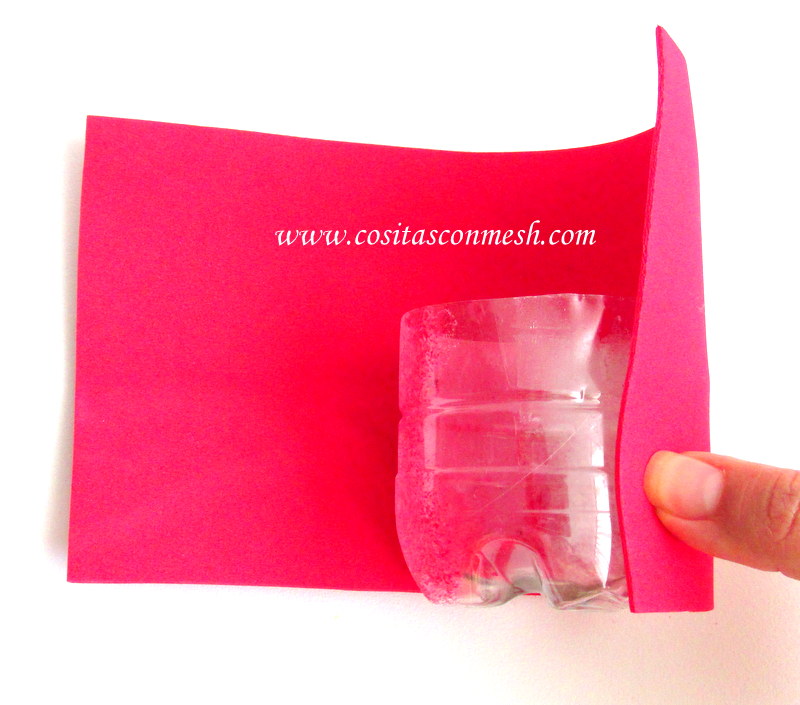 2.-Al usar una botella de 600 ml, corte la botella 6.5 cm.Usare foami color rojo de 22x 13 cm y con el forrare mi botella.