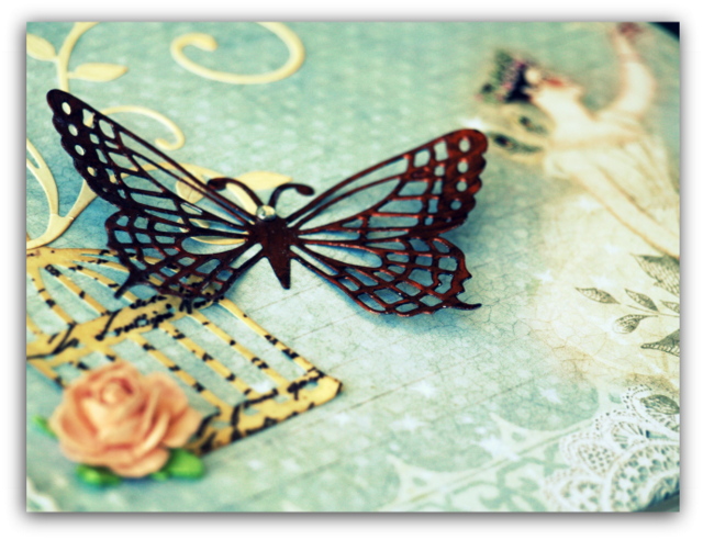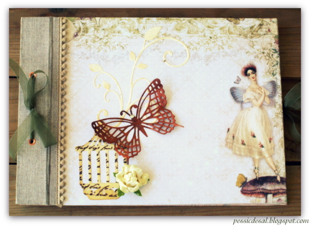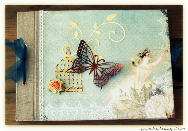 La encuadernación está hecha con hojas en blanco, porque ella va a llenarlo de fotos y entre cada una, un papel vegetal para pretegerlas. Los lomos estan hechos con tela y el resto con papel; cintas y puntillas y organza para los lazos, porque asi no se ve tan recargado, ya que además del que lleva en el lomo, quería que se pudieran cerrar tambien... Pocos adornos porque los papeles ya tienen un fondo bastante estampado y no quería sobrecargarlos: unas jaulitas estampadas y embosadas en transparente, unos arabescos y maripositas pintadas con acrilica cobre.
